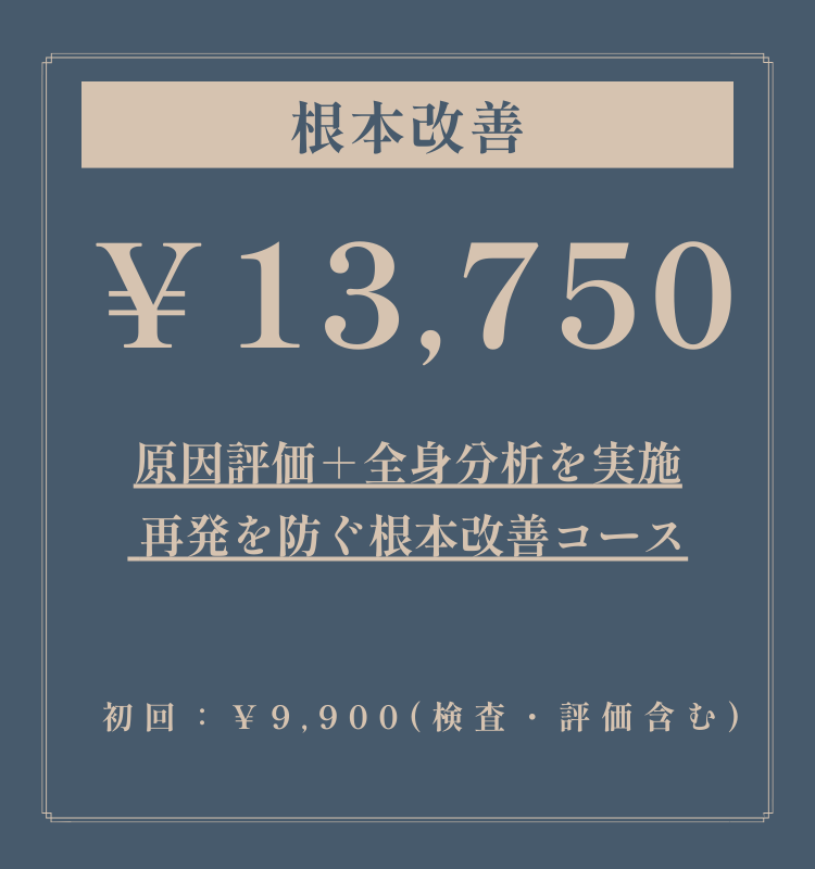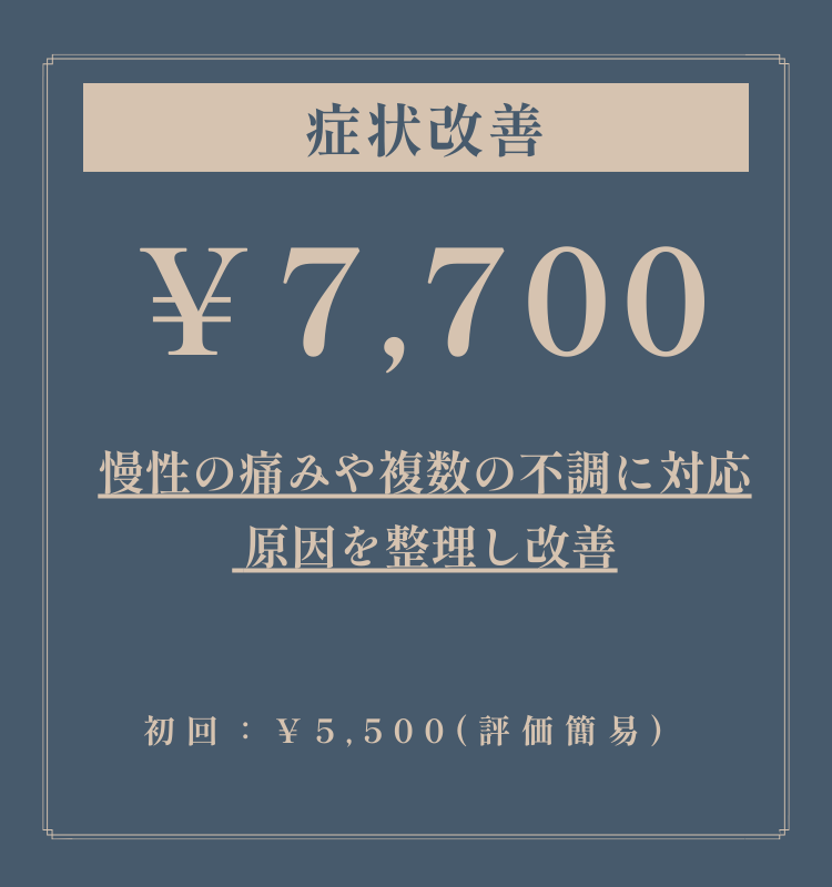 その上で、施術+セルフケア指導を組み合わせ、再発しない身体づくりを行います。